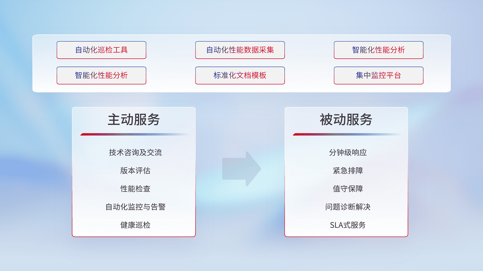 智能化工具和标准化文档,,,保障服务质量,,,,提供主动服务(包含技术咨询、、、版本评估、、、性能检查、、自动化监控与告警、、、、健康巡检)和被动服务包含(分钟级响应、、紧急排障、、值守保障、、、、问题诊断解决、、、SLA服务)。。