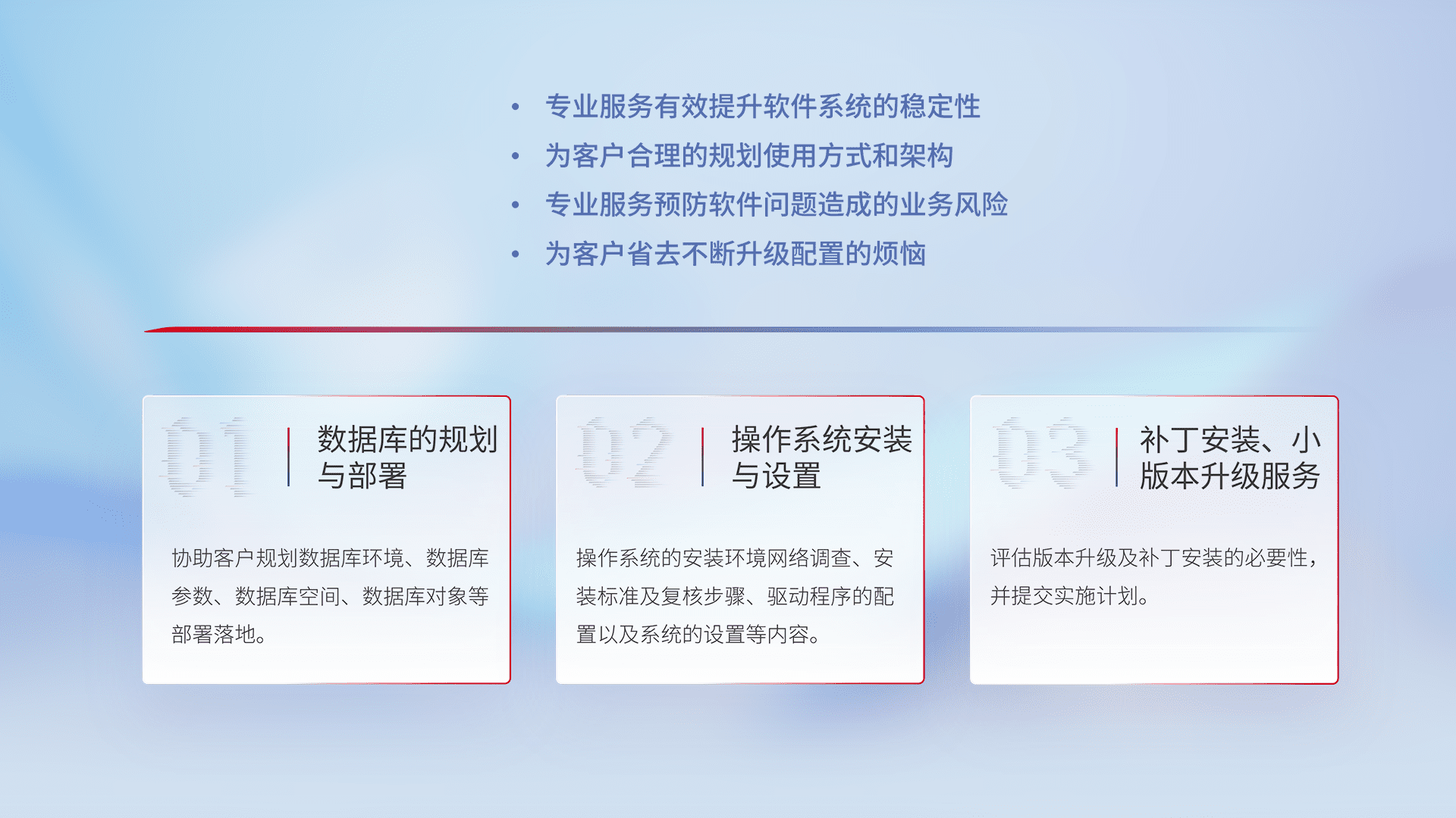 为客户提供软件规模升级、、、、快速部署、、、、按需配置的专业服务,,,,从数据库的规划与部署到操作系统的安装与设置,,再到补丁安装和小版本升级提供支持。。